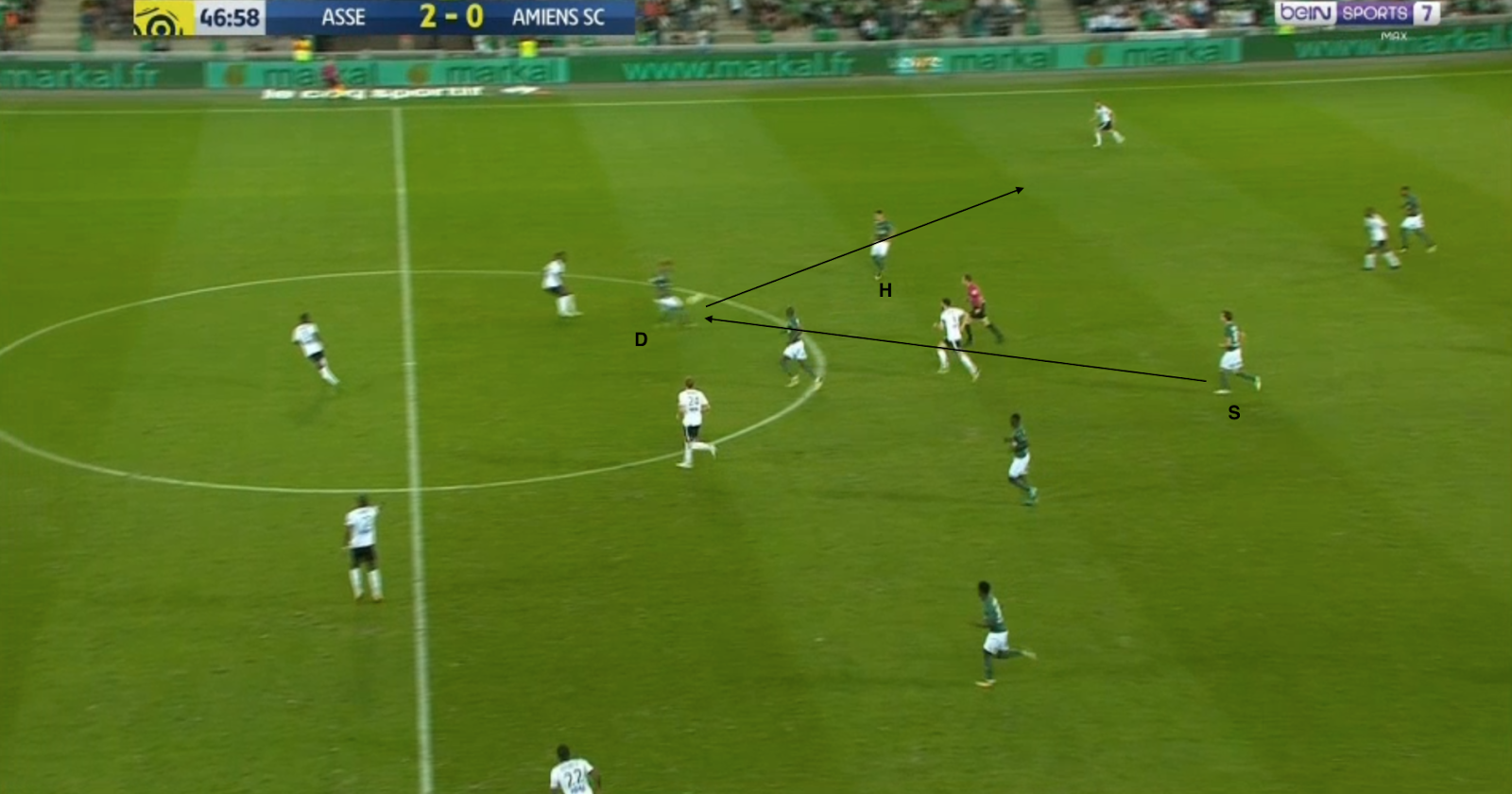 Sa montée remet ses coéquipiers en jeu, il sert Moribot (6) qui sprinte aussi - il ne reste plus que 3 adversaires et il a du soutien, mais il tergiverse.