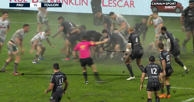 Rebbadj (4), Belleau (12), Ikpefan (11), Heem (15), Hériteau (13) et Ollivon (6) sont dans le ruck, le dernier sort le ballon et fixe un peu plus la défense. Ce qui porte ses fruits :