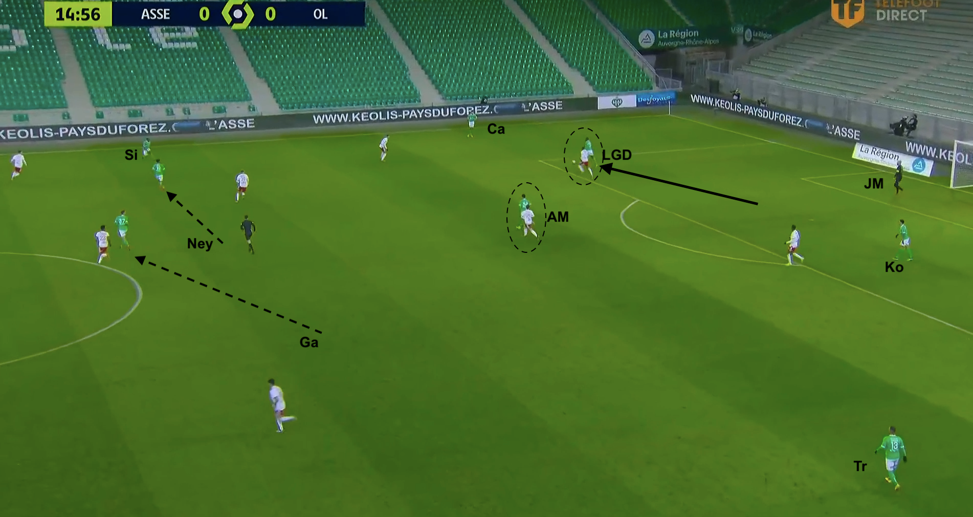Les Verts commencent une attaque en envoyant le ballon d'abord à gauche, où Trauco remet vers l'intérieur avec Neyou, qui rejoue en arrière avec Camara. Les Lyonnais ne pressent pas, mais restent haut avec la même intention de ne pas permettre une sortie de balle propre :